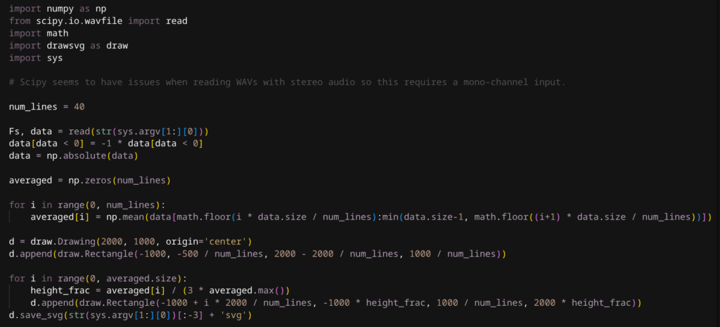During the process, one of the students used the SciPy and DrawSVG Python libraries to generate waveform images from audio in the desired style.